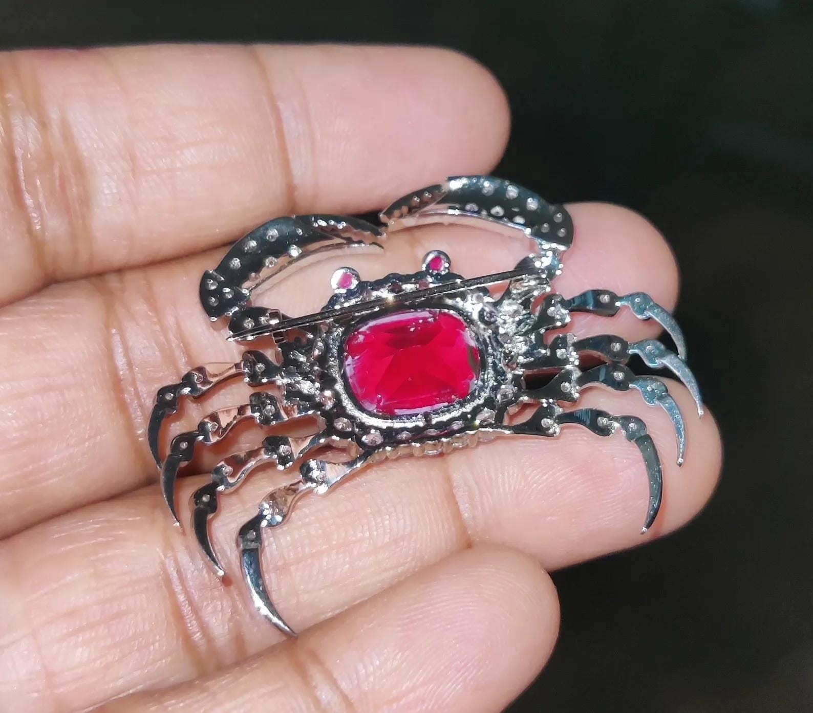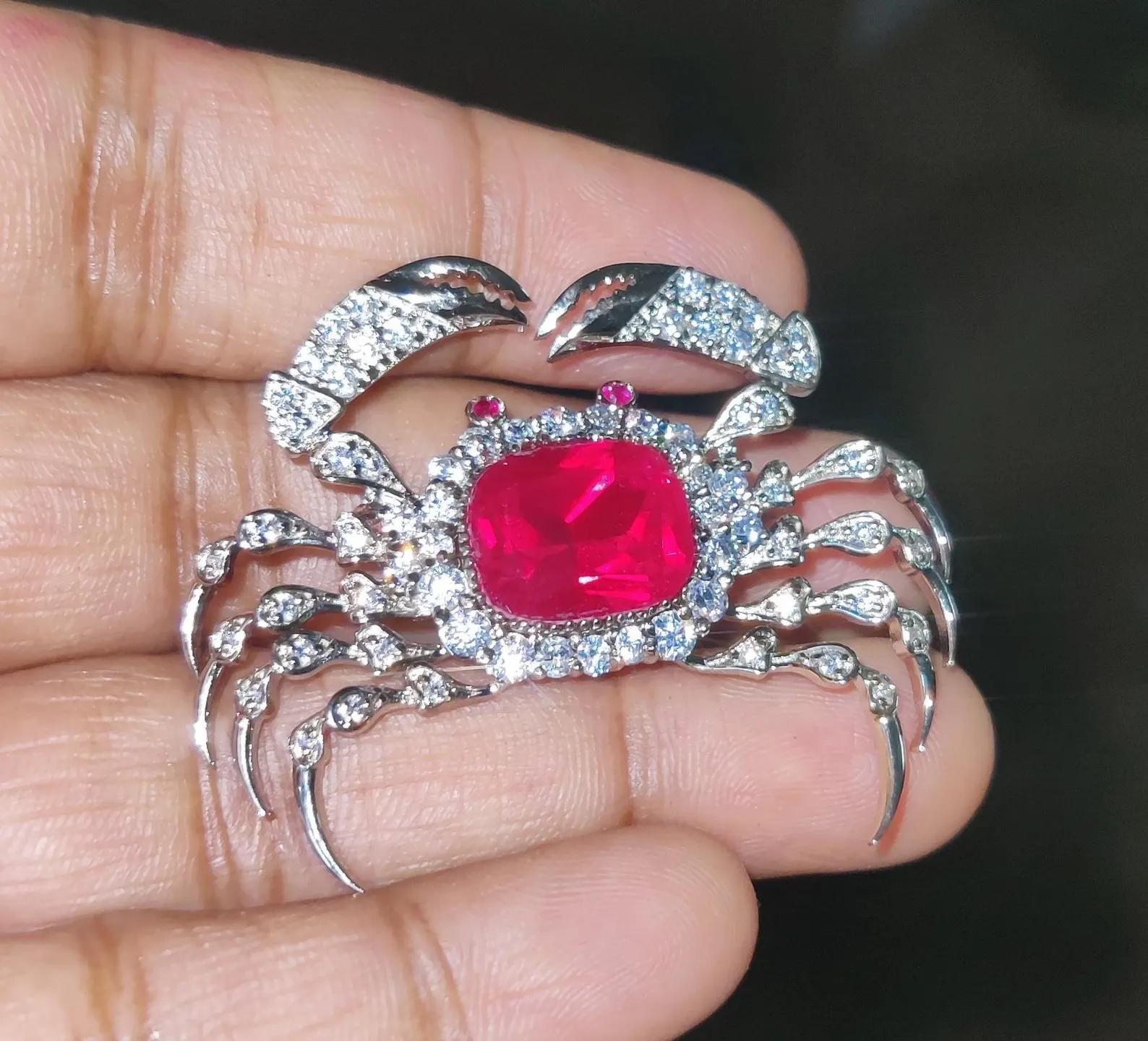2Ct Diamond Brooch Pin, Crab Shape Brooch, Lab-Created Red Ruby Diamond 14K White Gold Plated 925 Sterling Silver, Special Occasion wear