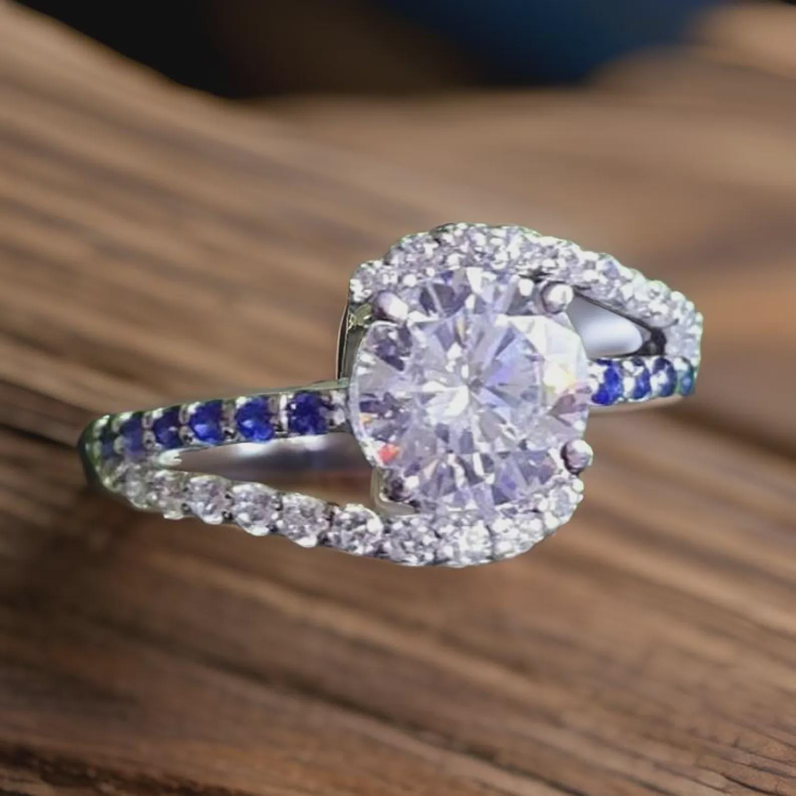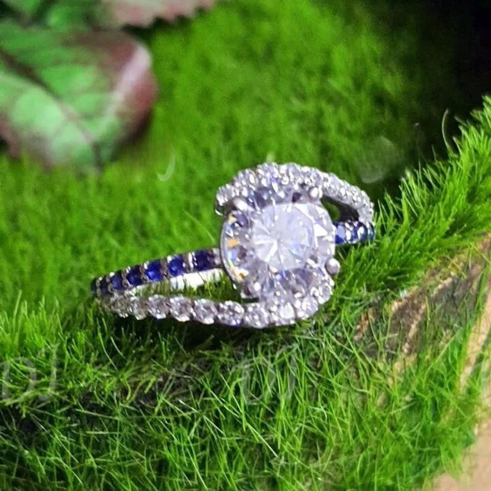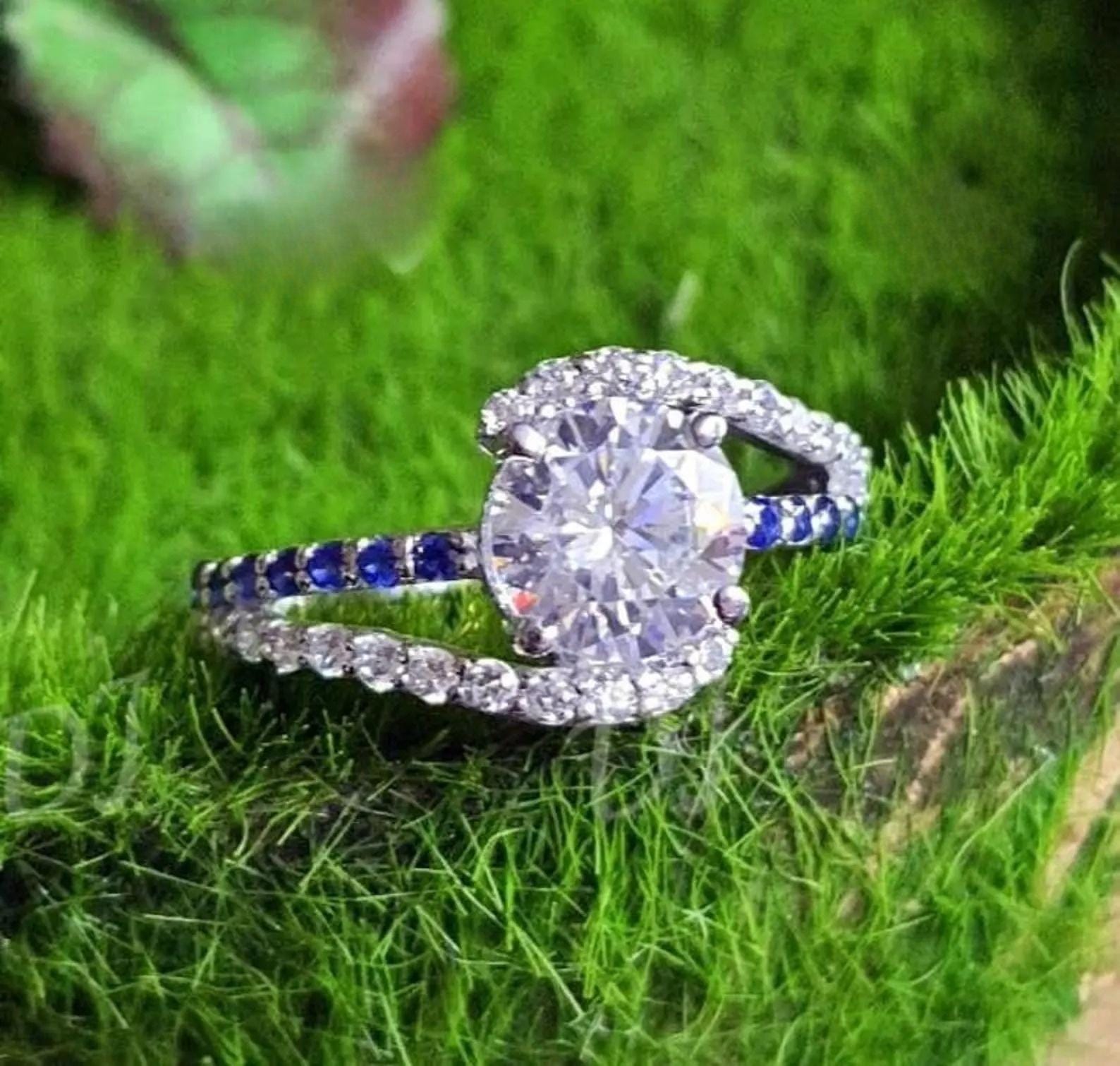 2Ct Round Cut Simulated White Diamond and Sapphire Wedding Women Engagement Anniversary Ring 14k White Gold Plated- 925 Silver, Gift for Her