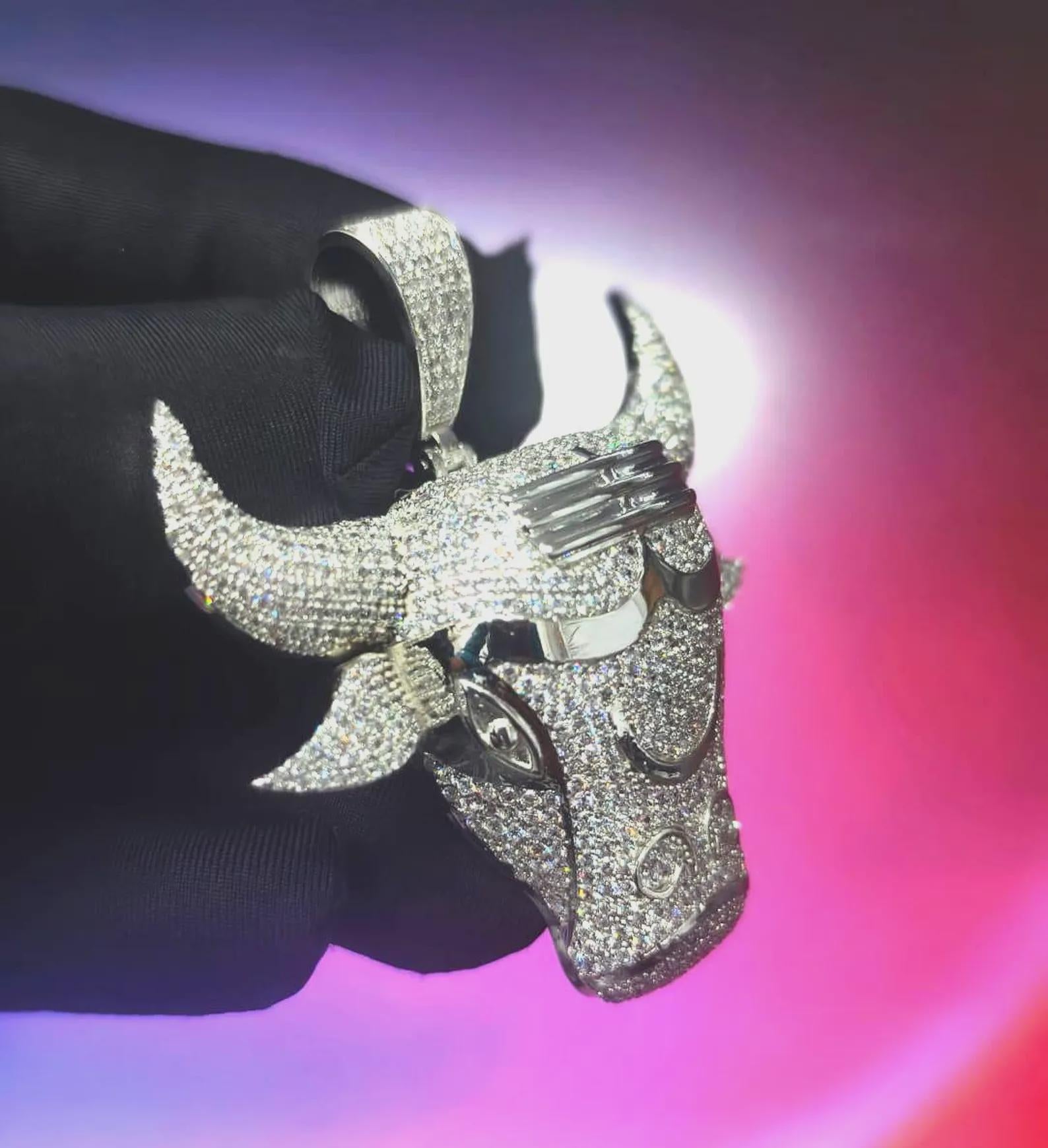 2Ct Round Cut Simulated White Diamond Bull Head Pendant 14K Yellow Gold Plated Free Chain 18" 925 Silver, Custom Hip Hop Animal Pendant