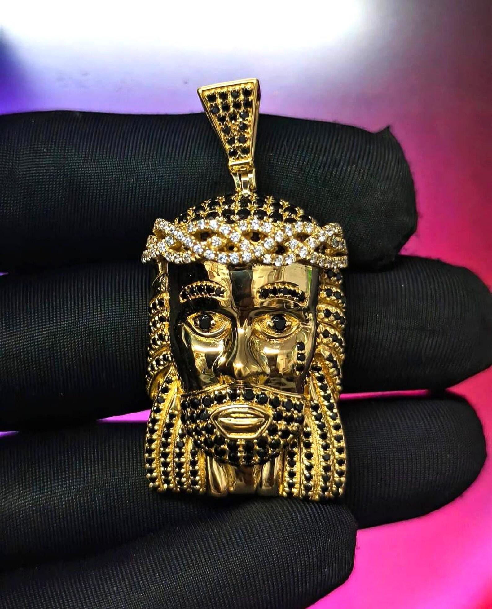 3Ct Round Cut Simulated Black and White Diamond Jesus Face Pendant 14K Yellow Gold Plated Free Chain 18" 925 Silver, Hip Hop Custom Pendant