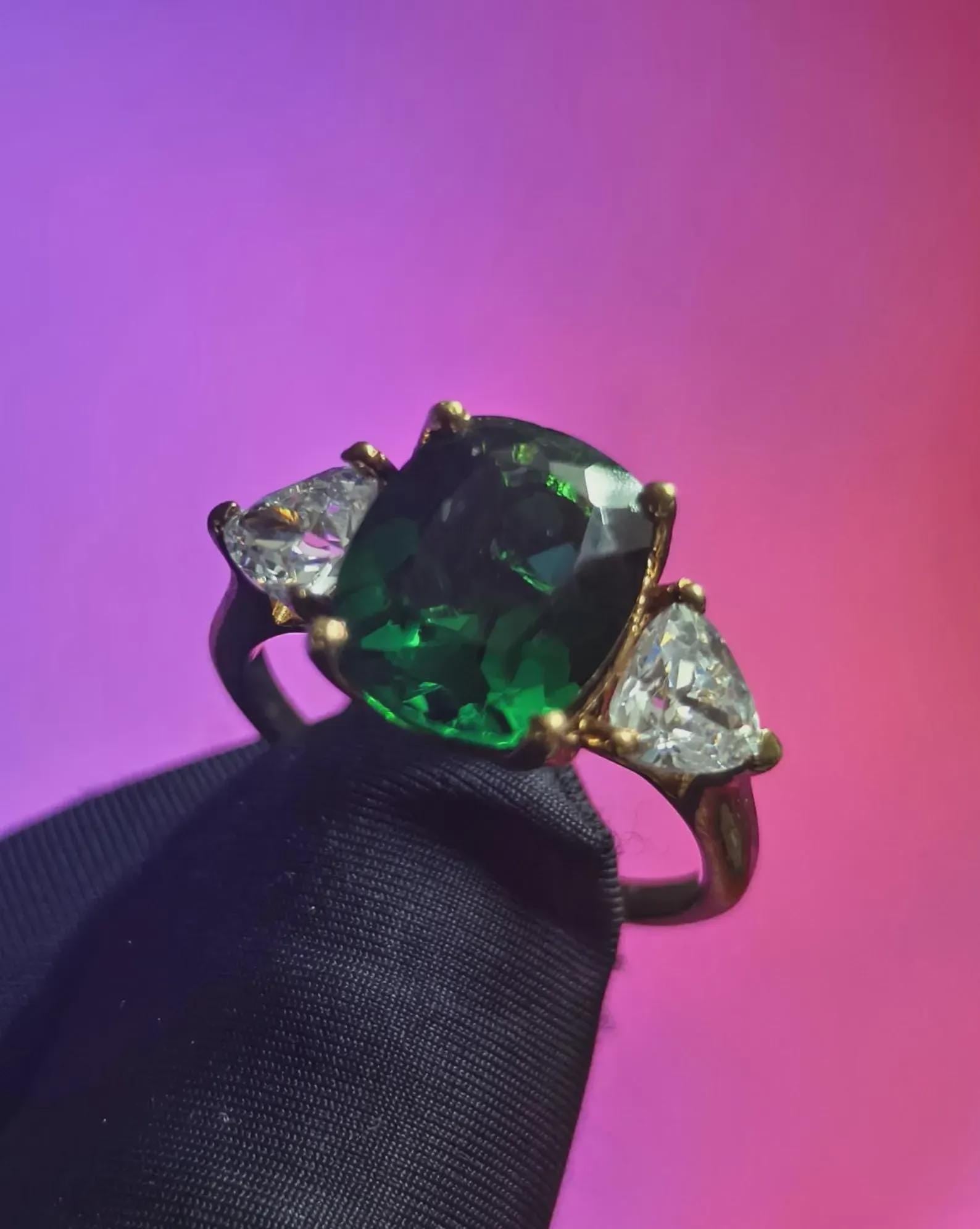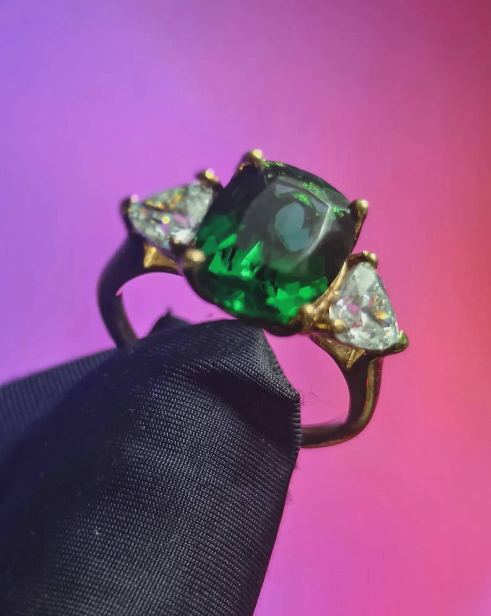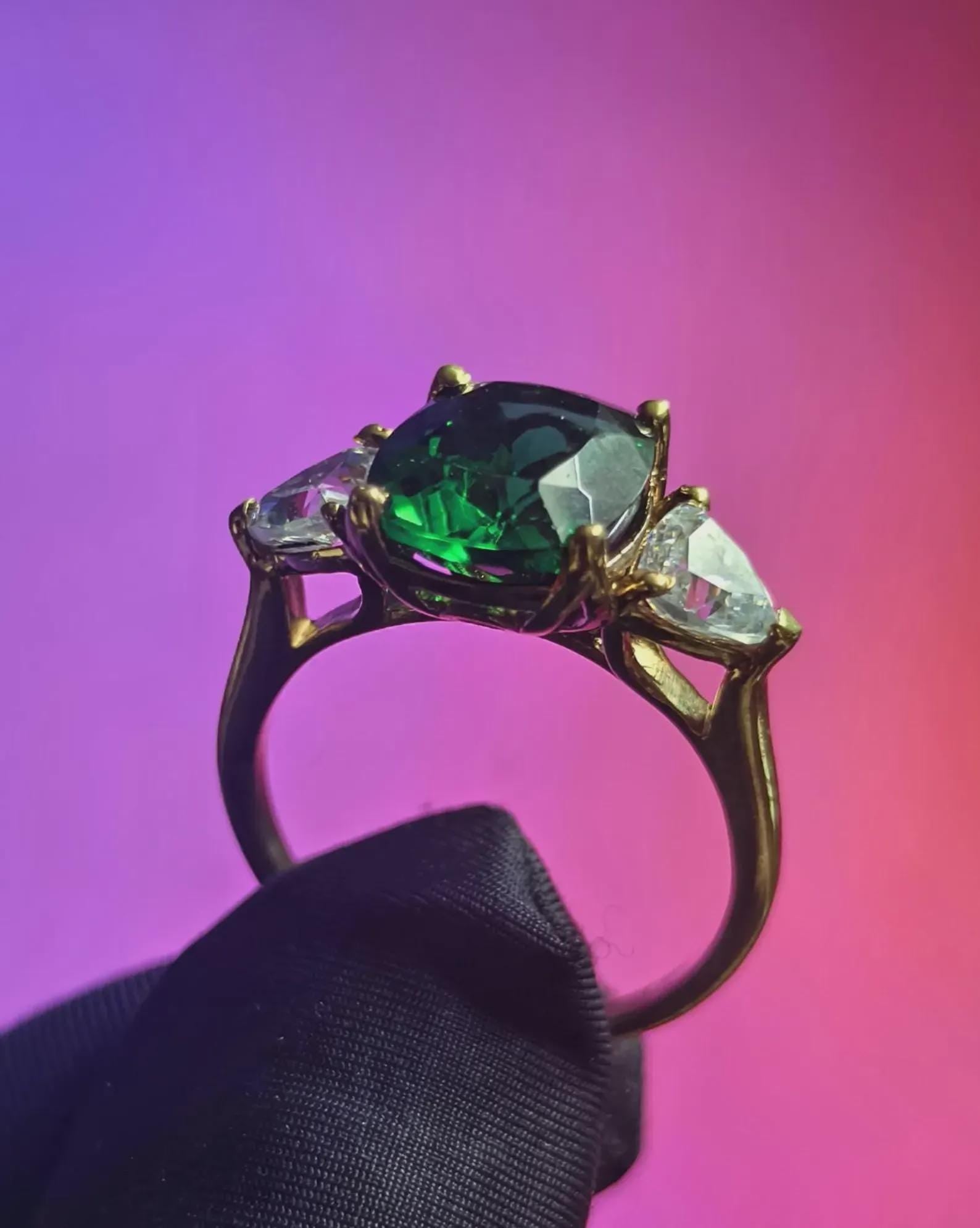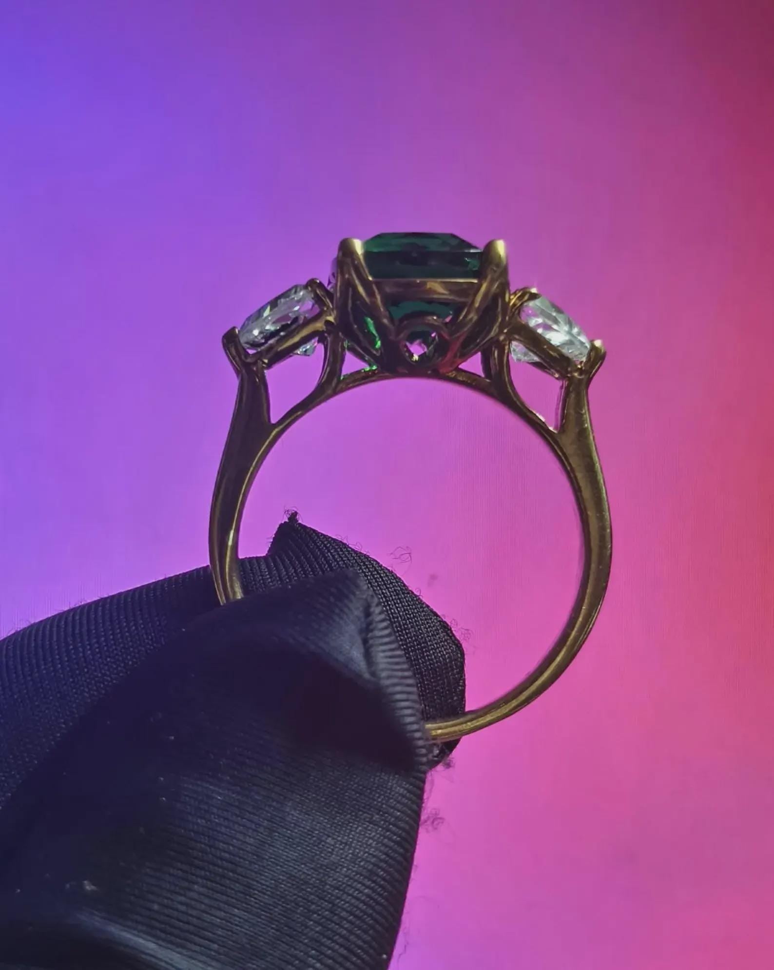 Three Stone Cushion Cut Simulated Green Emerald Diamond 14K Yellow Gold Plated 925 Sterling Silver, Anniversary Ring, Wedding Solitaire Ring